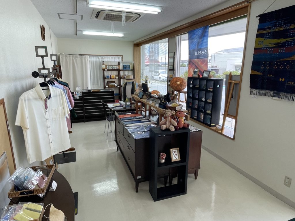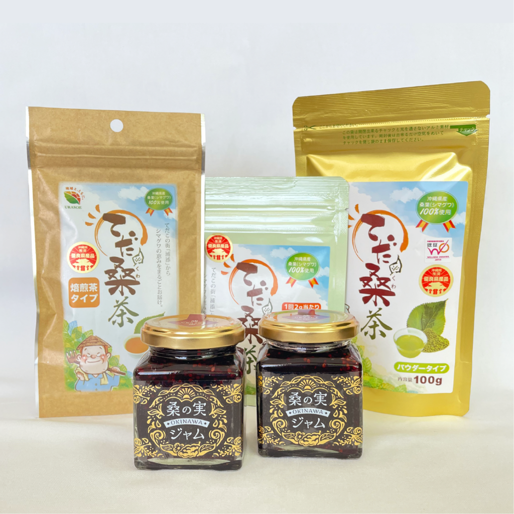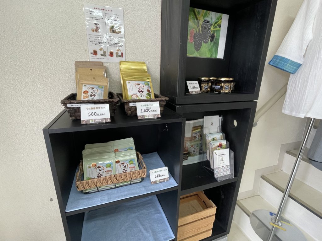 1Fのショップでは桑茶や桑ジャム、うらそえ織りの商品などを販売しております。